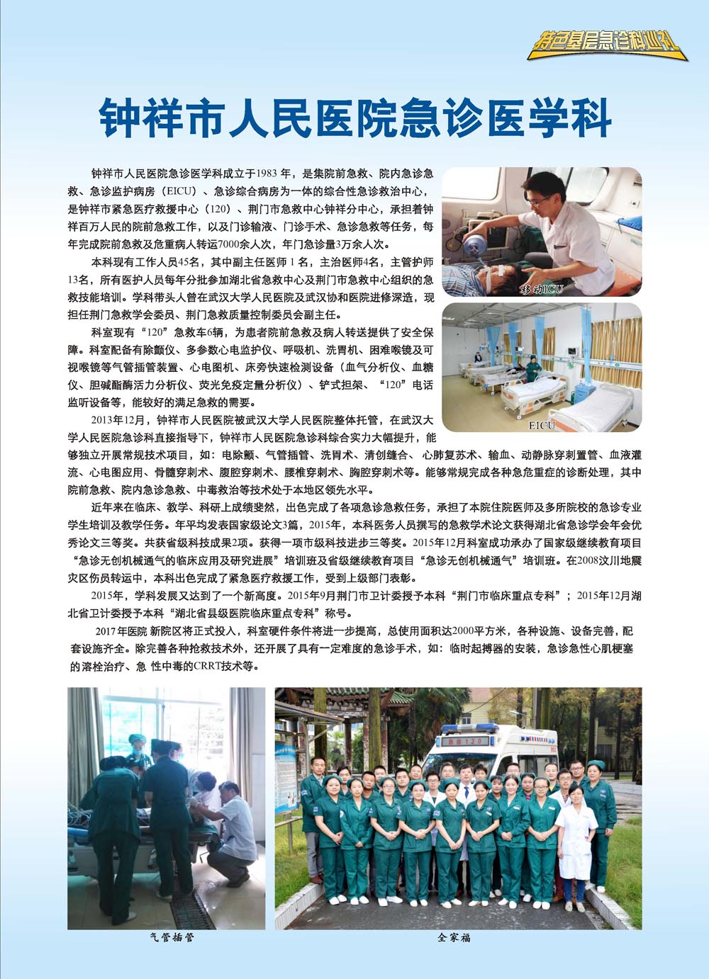 钟祥市人民医院急诊医学科成立于1983年,是集院前急救、院内急诊急救、急诊监护病房(EICU)、急诊综合病房为一体的综合性急诊救治中心,是钟祥市紧急医疗救援中心(120)、荆门市急救中心钟祥分中心,承担着钟祥百万人民的院前急救工作,以及门诊输液、门诊手术、急诊急救等任务,每年完成院前急救及危重病人转运7000余人次,年门急诊量3万余人次。