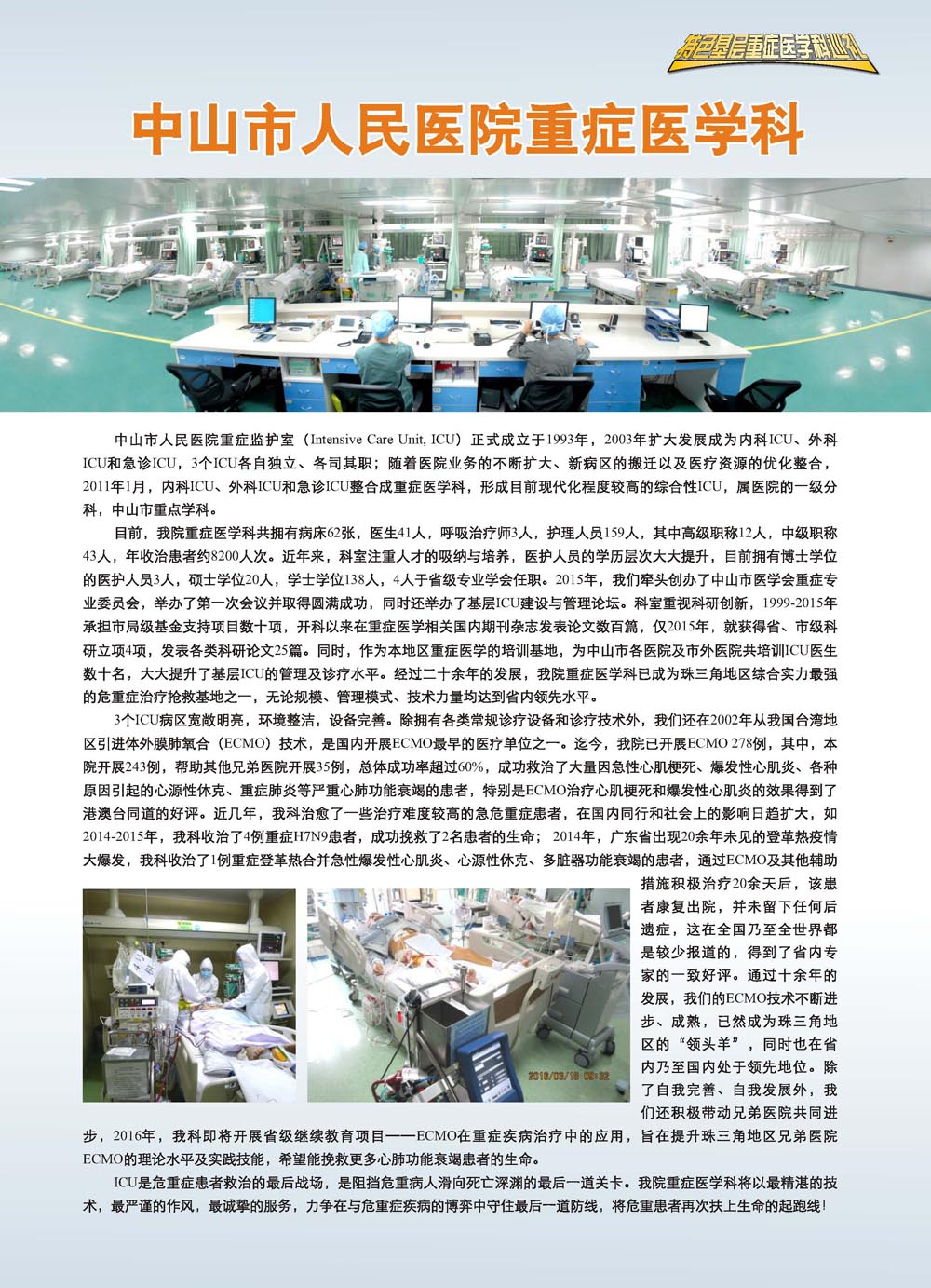 中山市人民医院重症监护室(Intensive Care Unit, ICU)正式成立于1993年,2003年扩大发展成为内科ICU、外科ICU和急诊ICU,3个ICU各自独立、各司其职;随着医院业务的不断扩大、新病区的搬迁以及医疗资源的优化整合,2011年1月,内科ICU、外科ICU和急诊ICU整合成重症医学科,形成目前现代化程度较高的综合性ICU,属医院的一级分科,中山市重点学科。