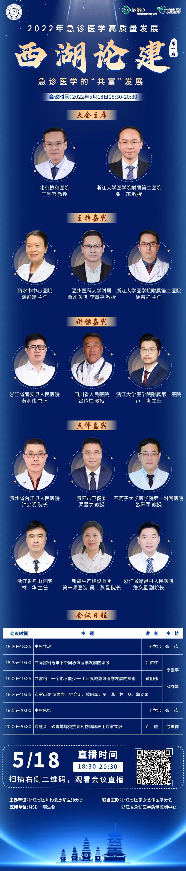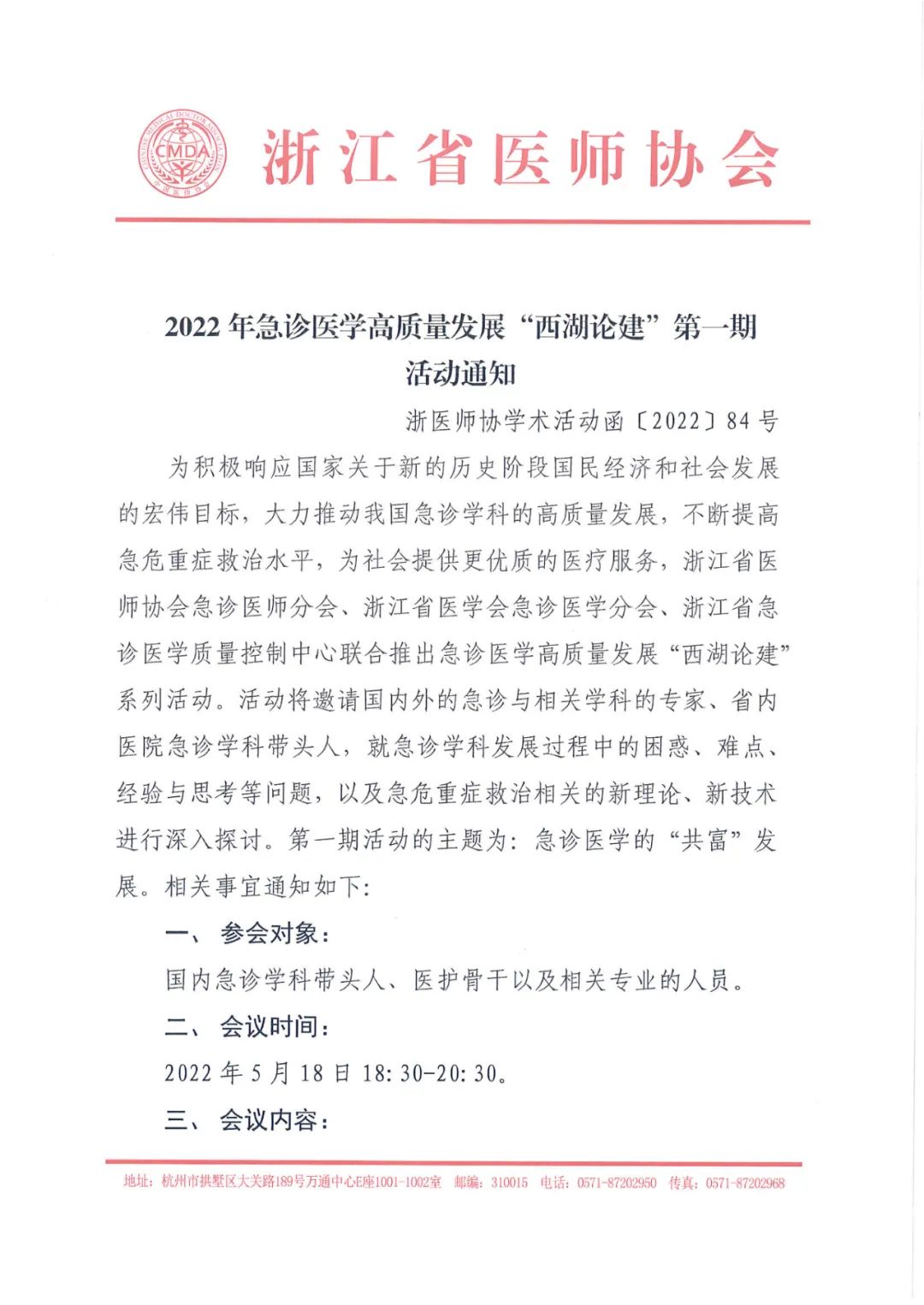 为积极响应国家关于新的历史阶段国民经济和社会发展的伟大目标,大力推动我国急诊学科的高质量发展,不断提高急危重症救治水平,为社会提供更优质的急诊医疗服务,浙江省医师协会急诊医师分会、浙江省医学会急诊医学分会、浙江省急诊医学质量控制中心联合推出急诊医学高质量发展“西湖论建”系列活动。活动将邀请国内外急诊与相关学科的专家、省内医院急诊学科带头人,就急诊医学发展过程中的前沿热点、困惑、难点、经验与思考等,以及急危重症救治相关的新理论、新技术进行深入探讨。会议将定期通过线上交流的形式举行,每期会议围绕着一个主题展开。热烈欢迎广大专家与同仁们踊跃参与,为在新的历史阶段促进我国急诊医学的高质量发展贡献您的聪明才智与力量!