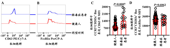 就粒细胞群中单个Bas表达CD63和FcεRIα MFI的水平而言,脓毒症患者CD63的MFI的表达水平较健康人增加了67.4%(Z=-3.294,P=0.0007;图 5A、C),而健康人和脓毒症患者FcεRIα MFI表达水平差异无统计学意义(Z=-0.523,P=0.6062;图 5B、D)。