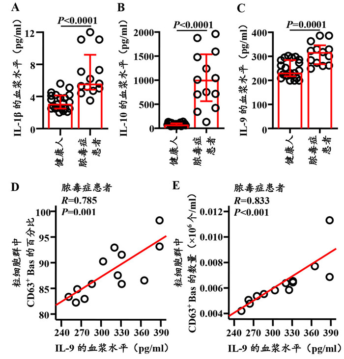 与健康人相比,脓毒症患者血浆IL-1β、IL-10和IL-9的水平分别增加了80.6%(Z= -4.258,P < 0.0001;图 6A)、11.9倍(Z=-4.814,P=0.0001;图 6B)和36.7%(Z=-3.606,P=0.0001;图 6C)。此外,脓毒症患者血浆IL-9的水平与粒细胞群中CD63+Bas的比例(R=0.785,P=0.001;图 6D)和数量(R=0.833,P < 0.001;图 6E)均高度正相关。