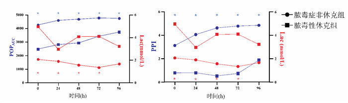 1.2.1 数据采集采集患者基本信息资料,并动态记录和计算患者在入院治疗后第0小时、第24小时、第48小时、第72小时、第96小时的POPAUC、PPI、Lac;并收集PaO2/FiO2、血小板计数、血清胆红素浓度、平均动脉压、治疗过程中血管活性药物的使用情况、GCS评分、血清肌酐值、24 h尿量,计算SOFA评分;收集体温、平均动脉压、心率、呼吸频率、PaO2、血气pH、Na+、K+、Cr、红细胞比容、白细胞计数、GCS评分、年龄、既往器官功能不全或免疫抑制病史,计算APACHE Ⅱ评分。