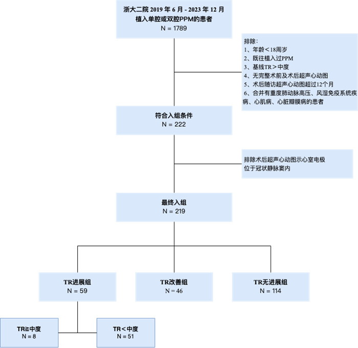 1 资料与方法 1.1 研究对象连续收集2019年6月至2023年12月于浙江大学医学院附属第二医院首次植入永久心脏起搏器(permanent pacemaker,PPM)的患者,起搏器的类型包括单腔右心室起搏(VVI)和双腔起搏器(DDD)。纳入标准:①所有入选患者术前符合心脏起搏器植入Ⅰ类和Ⅱa类适应证,其中2019年6月至2021年8月的患者根据《2018 ACC/AHA/HRS心动过缓和心脏传导延迟患者评估及管理指南》,2021年9月至2023年12月的患者根据《2021ESC心脏起搏器和心脏再同步治疗指南》;②经锁骨下静脉途径植入心脏起搏导线。排除标准:①年龄小于18周岁;②既往植入过起搏器;③基线TR>中度;④无完整术前及术后超声心动图;⑤术后随访超声心动图超过12个月;⑥合并有重度肺动脉高压、风湿免疫系统疾病、心肌病、心脏瓣膜病的患者。