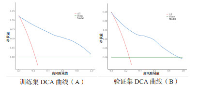 | 图 3 DCA曲线对比图 Fig 3 DCA curve for the training set (A) Validation set DCA curve (B) |