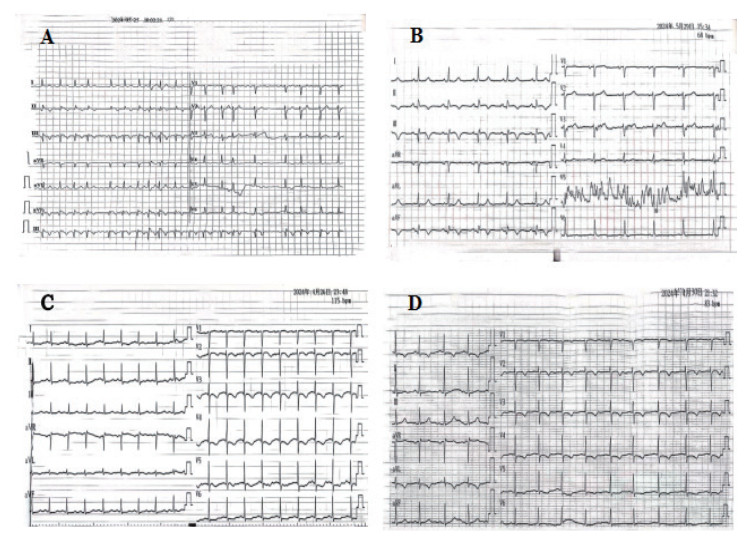 | A:患者1(快速型心房颤动)用药前心电图(心室率117次/min),B:患者1用药后心电图(心室率67次/min)。C:患者2(窦性心动过速)用药前心电图(心室率114次/min),D:患者2用药后心电图(心室率84次/min) 图 1 2名患者应用艾司洛尔前后的心电图 |