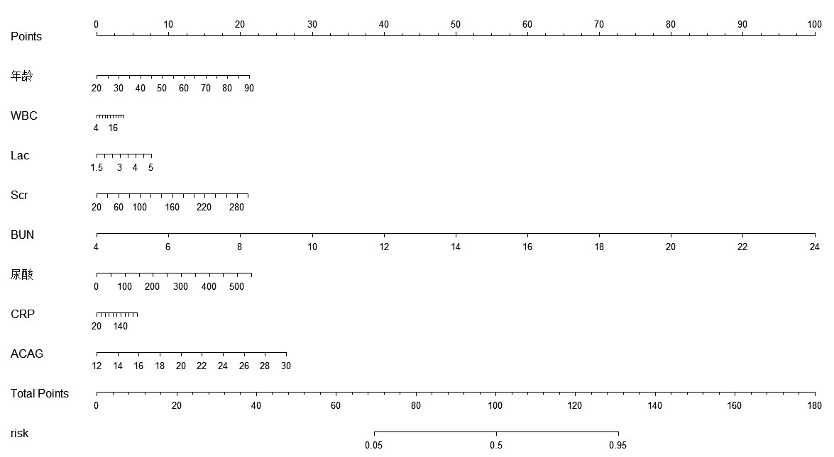 综上所述,年龄、WBC、Lac、Scr、BUN、尿酸、CRP以及ACAG这些因素,均与脓毒症患者发生AKI存在关联,基于这些风险因素,构建出用于预测脓毒症患者发生AKI风险的列线图模型,该模型具备良好的区分能力、校准能力以及临床实用价值,有助于临床医师早期识别AKI的高危患者,进而采取积极有效的预防和治疗措施,以改善患者的预后。