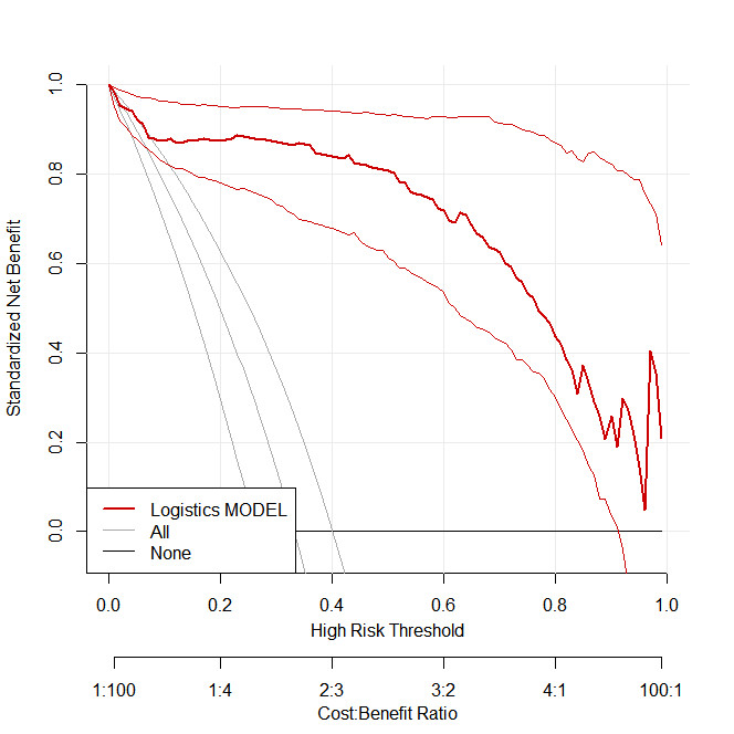 DCA曲线结果显示,基于多因素分析结果构建的列线图模型预测概率在0.01~0.95时,临床实际应用效果较好,临床获益良好,见图 4。
