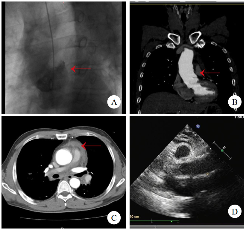 病例2,男,47岁,因“突发背痛伴胸闷1 h”入院。查心电图提示下壁导联ST段抬高0.1 mv,TTE提示节段性室壁运动异常,升主动脉及窦内径增宽,肌钙蛋白阴性,考虑“急性心肌梗死”。行急诊冠脉造影术,见冠状动脉通畅,加行主动脉造影见根部后壁斜行龛影(图 2A)。予查主动脉CTA,见主动脉根部左冠状动脉开口上方条状影(图 2B),该处主动脉直径为44 mm,升主动脉周围少量心包积血(图 2C),提示LIT。建议急诊开胸手术,患方自行至外院行升主动脉置换术,术中所见符合LIT,术后2个月至本院复查TTE,见升主动脉人工血管通畅(图 2D),无室壁运动异常。后门诊随访5年,情况平稳。
