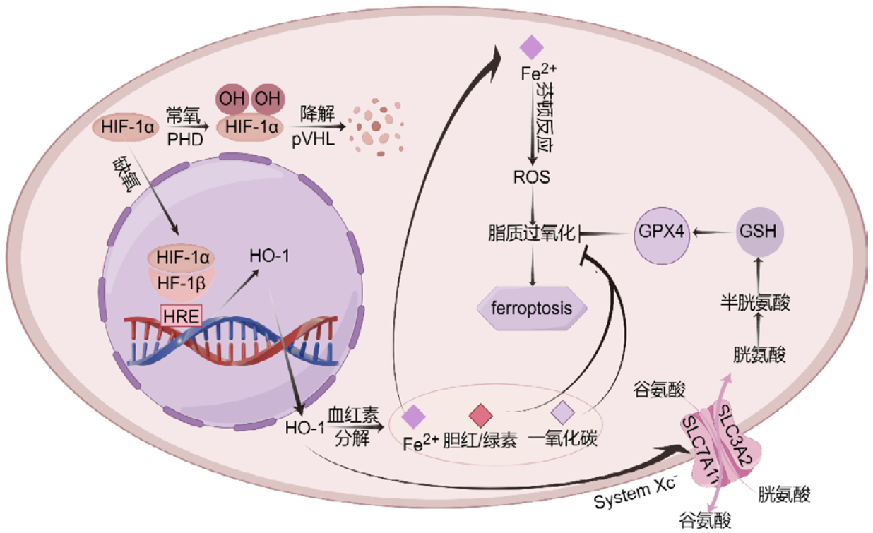 HIF-1α/HO-1信号通路对抑制铁死亡的作用重要且不可忽视,一方面该通路可以上调抑制铁死亡分子的表达(SLC7A11、GPX4等),一方面HO-1的分解产物胆红素/胆绿素和CO作为内源性抗氧化剂,能够直接中断脂质过氧化,最终表现出抑制铁死亡的作用。但其最终效应取决于细胞的代谢状态、应激强度和通路激活的持续时间。