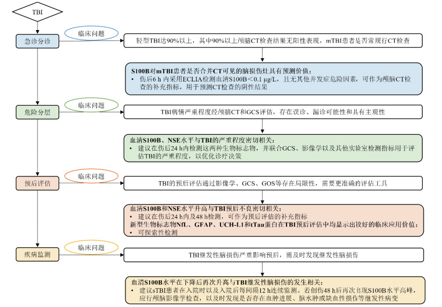 | 图 1 急性脑损伤生物标志物在TBI中的应用价值和检测建议 |