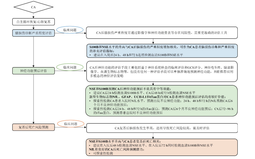 | 图 2 急性脑损伤生物标志物在CA中的应用价值和检测建议 |