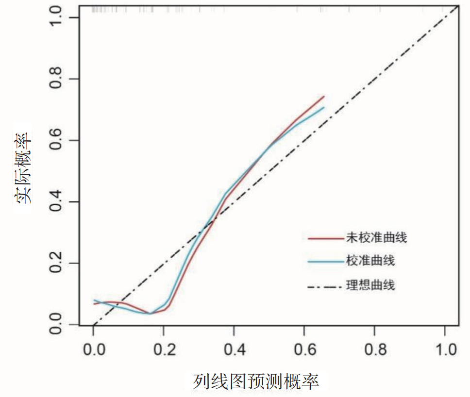 | 图 3 列线图预测模型的校准曲线 Fig 3 Calibration curve of nomogram prediction model |