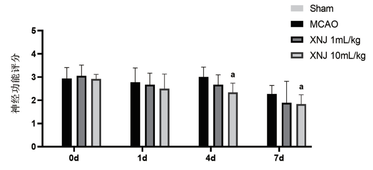 | 注:MCAO,脑缺血-再灌注损伤;XNJ,醒脑静注射液;vs. MCAO,aP < 0.05 图 1 大鼠神经功能评分 Fig 1 Neurological function score in rats |