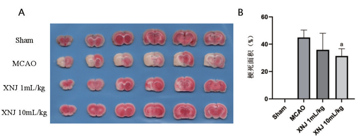 1.2 实验方法 1.2.1 MCAO模型的建立及实验分组SD大鼠经腹腔注射1.25%三溴乙醇麻醉后固定,碘伏和酒精消毒颈部皮肤,于颈部皮肤正中切口,分离并游离右颈总动脉、右颈内动脉和颈外动脉。颈外动脉剪口,将线栓插入血管并沿颈内动脉插入约18~20 mm以堵塞大脑中动脉。缺血2 h后,将线栓重新拔出恢复血流灌注,动物苏醒后进行神经功能评分,并将造模成功动物随机分为假手术组(尾静脉注射同等剂量生理盐水)、模型组(尾静脉注射同等剂量生理盐水)、醒脑静低剂量组(尾静脉注射1 mL/kg XNJ)和醒脑静高剂量组(尾静脉注射10 mL/kg XNJ),每天给药1次,连续给药7 d。