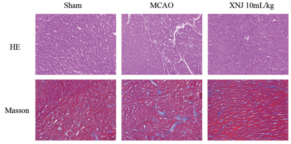 | 图 5 大鼠心脏HE染色和Masson染色(200×) Fig 5 HE and Masson staining of rat heart tissue (200×) |