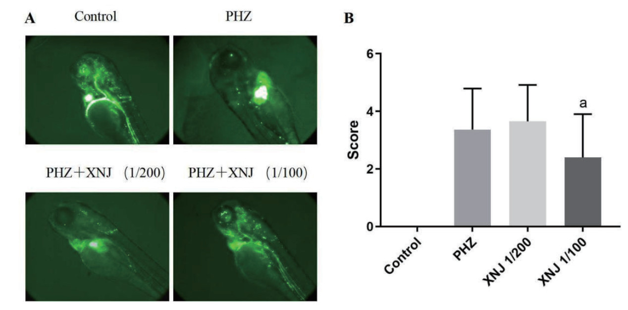 | A:各组斑马鱼脑部血流代表性荧光图像;B:斑马鱼脑部血流受阻情况评分;vs. PHZ,aP < 0.05 图 6 醒脑静注射液对斑马鱼脑部血流的影响 Fig 6 Effect of XNJ Injection on cerebral blood flow in zebrafish |