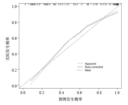 图 3 列线图模型的校准曲线 Fig 3 The calibration plot for the nomogram model