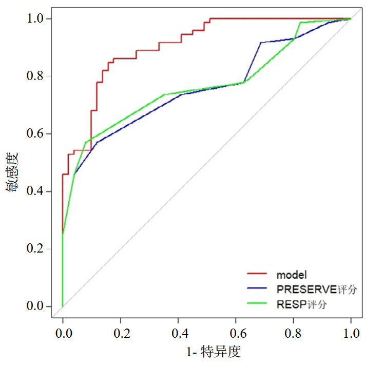 将本研究开发的新模型与RESP评分及PRESERVE评分模型进行预测价值的比较(表 3图 6),AUC分别为0.906、0.759和0.766,使用Delong检验对三条曲线进行比较,结果显示新模型与另外两种评分AUC相比,差异有统计学意义(Model vs. PRESERVE评分,P=0.001;Model vs. RESP评分,P=0.002),结果显示本研究模型评分判别能力优于上述两种预测评分工具。