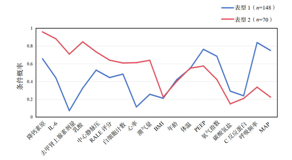 本研究共纳入218例ARDS患者。使用18个临床指标作为外显变量,适配检验后最终确定最佳模型为2类别模型见表 1,在此模型下亚表型1组的ARDS患者为148例,亚表型2组的ARDS患者为70例,两组亚表型患者的临床特征差异有统计学意义。与亚表型1组相比,亚表型2组的ARDS患者表现出炎症指标降钙素原、白介素-6(interleukin-6, IL-6)升高,去甲肾上腺素使用剂量更高,乳酸、中心静脉压及RALE评分升高;氧合指数、碳酸氢根、平均动脉压降低。见图 1