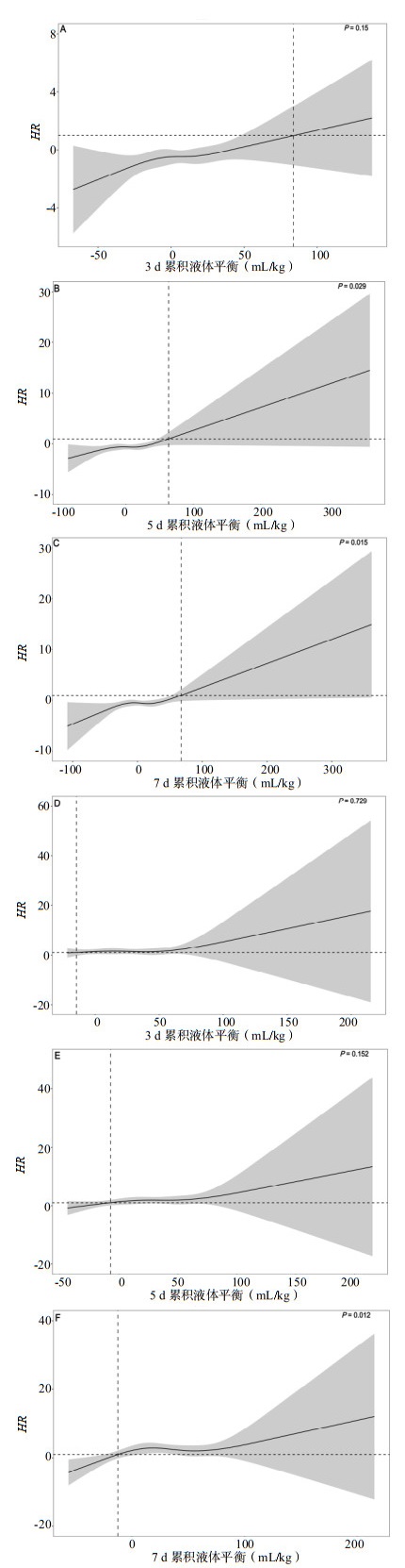 累积液体平衡(mL/kg)=(累积入量-累积出量)/体重(kg)。计算3 d、5 d和7 d的累积液体平衡时,分别用3 d、5 d和7 d的累积液体总量除以体重(kg)。