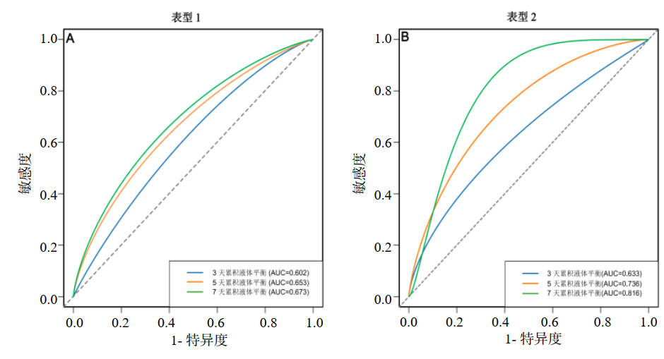 2.5 ROC曲线分析两组ARDS亚表型不同天数累计液体平衡对结局的预测能力