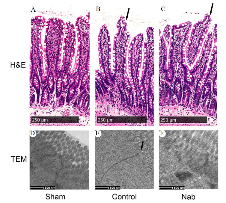注:图A~C分别为光镜下假手术组、单纯心肺复苏组及丁酸钠组回肠上皮组织情况(×200);图D~F分别为电镜下假手术组、单纯心肺复苏组及丁酸钠组回肠上皮组织情况(×50 000) 图 1 各组大鼠回肠上皮病理学评估 Fig 1 Pathological evaluation of ileal epithelium of rats in each group