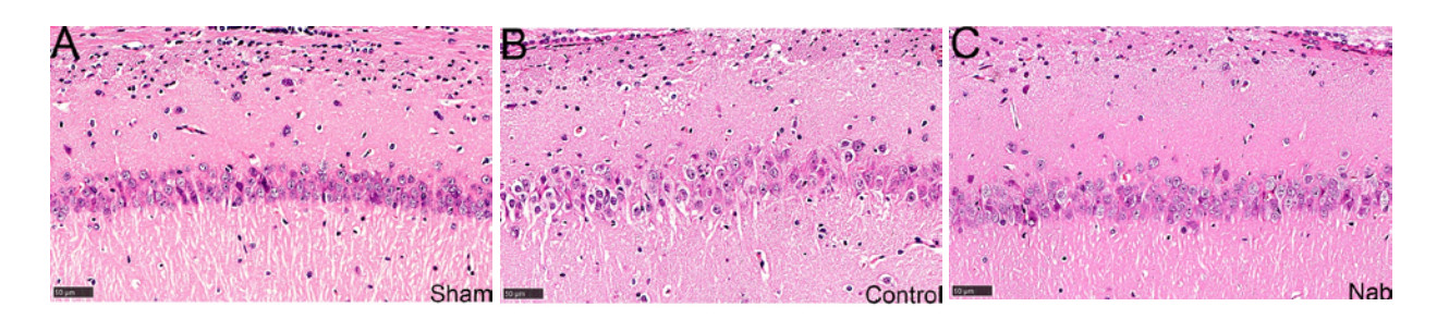 注:图A~C分别为光镜下假手术组、单纯心肺复苏组及丁酸钠组海马CA1区组织情况(×600) 图 2 各组大鼠脑组织CA1区形态学观察 Fig 2 Morphological observation of the CA1 region of rats from each group