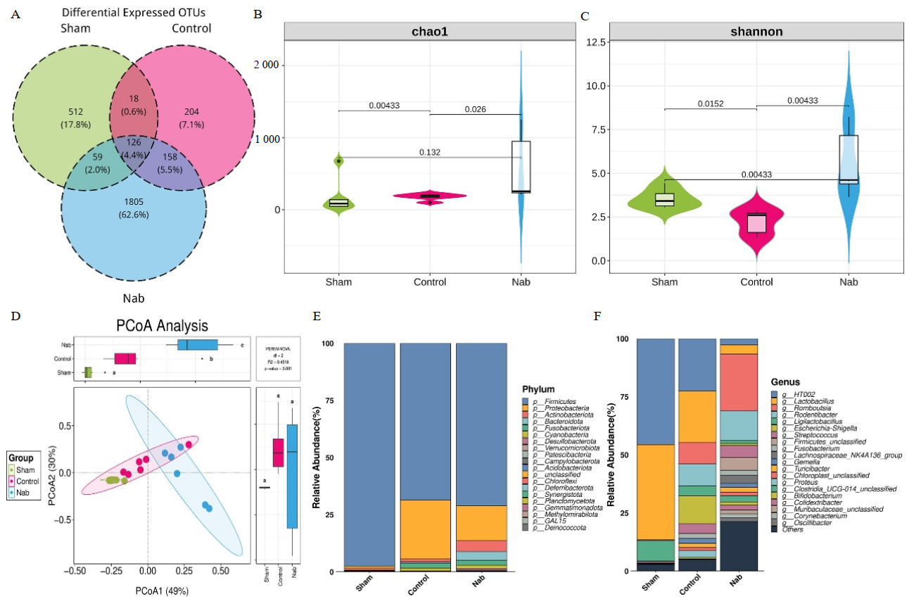 注:A为三组大鼠OUTs韦恩图;B为Alpha多样性分析——chao1指数小提琴图;C为Alpha多样性分析——Shannon指数小提琴图;D为Beta多样性分析——基于Weighted_Unifrac距离的PCoA分析图;E为门水平微生物组成的相对丰度柱状堆叠图;F为属水平微生物组成的相对丰度柱状堆叠图;Sham为对照组,Control为单纯心肺复苏组,Nab为丁酸钠组 图 3 各组大鼠回肠菌群分析 Fig 3 Analysis of ileal microbiota of rats from each group