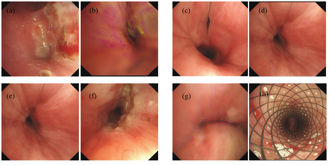 | 注:支气管肺泡灌洗术前(a)及术后(b);球囊扩张术前(c)及术后(d);激光蚀刻术前(e)及术后(f);金属覆膜支架置入术前(g)及术后(h) 图 1 支气管镜介入治疗前后对比 |