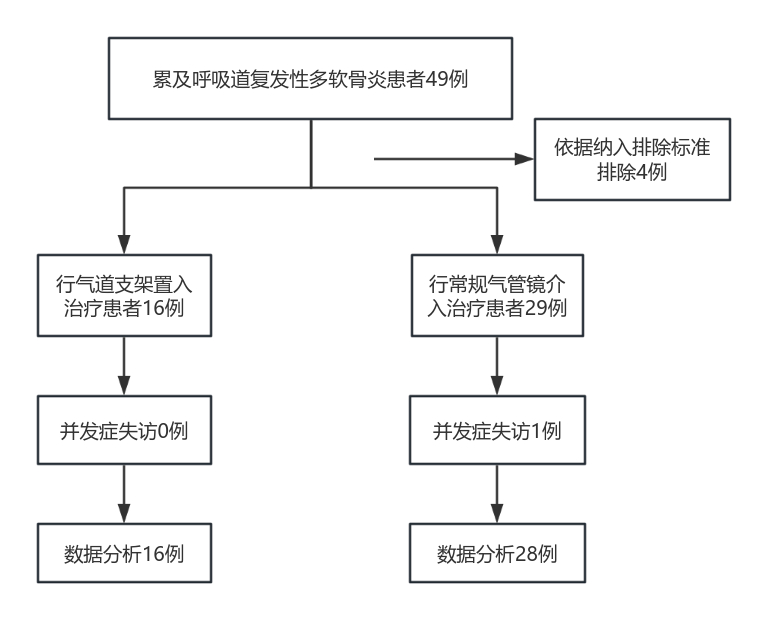 纳入标准:年龄≥18岁;依据Damiani-Levine诊断标准诊断为RP[13];支气管镜检查及动态CT提示RP累及呼吸道且气道塌陷程度≥50%;接受支气管镜检查及治疗。排除标准:正在接受气管插管或气管切开治疗的患者;患者术前肺泡灌洗液培养见真菌及多重耐药菌(multiple drug resistant organism, MDROS);患者诊治相关资料不全或缺失。