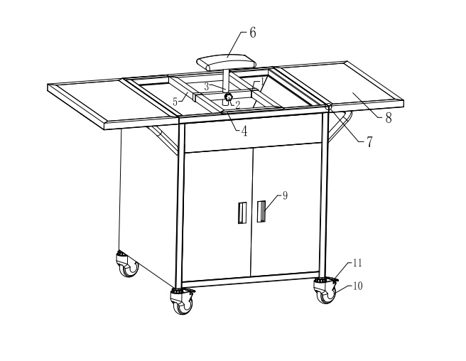 1.2 结构设计本产品由节力架和清创车主体2部分组成,外形结构见图 1、图 2。①节力架:根据清创车内部宽度、主体长轴的1/3长度,设计节力架的长方形基座,使用不锈钢制作(见图 1-4、5),在基座长轴设计可前后滑动的调节杆(见图 1-1),在调节杆的中间设计节力架,节力架通过不锈钢杆与调节杆衔接(见图 1-3),不锈钢杆通过调节器可调节节力架的上下高度(见图 1-2),节力架使用厚度5 cm外皮包裹的海绵软枕(见图 1-6)。②清创车主体:车主体由厚度为1.2 mm的304型号不锈钢板构建的长方体厢式车体,内部有容纳腔,车体正上面两侧铰接设有活动板为容纳腔开口,活动板沿铰接端翻转可打开或关闭车体容纳腔(见图 2-7、8); 车体的侧面设不锈钢双开门,便于清创垃圾的处理及清创车的终末清洁与消毒(见图 2-9); 车体底部配有2对3寸万向静音刹车滑轮,便于清创车的灵活性使用(见图 2-10、11)。