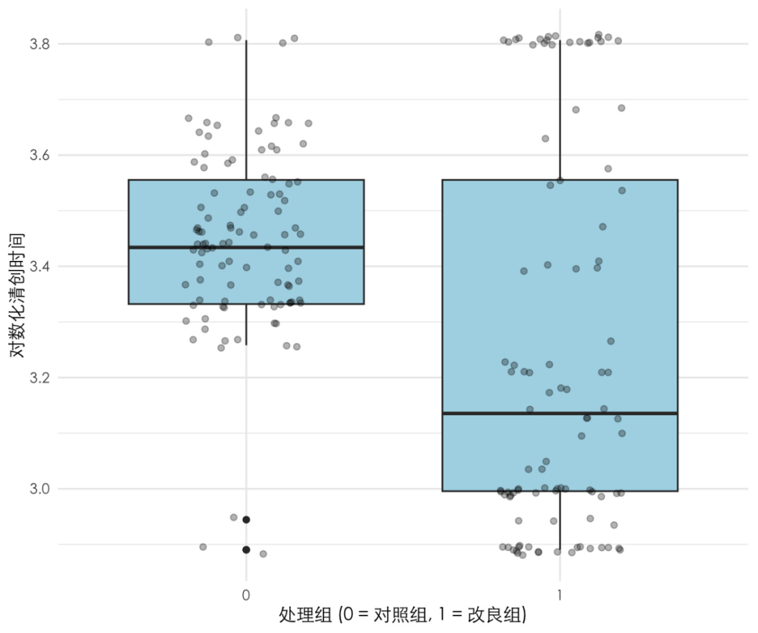 参照护理研究中量性研究的样本量估计方法与实验识别策略,双重差分模型可以表示为:Time=α+β1·treatment+β2·post+δ·(treatment×post)+γ·X+E; 其中:β1/beta是处理组与对照组之间的基准差异; ·Time表示清创手术时间; Treatment表示是否使用被改良的清创车; ·β2/beta是时间效应,即在处理前后所有医生清创效率的平均变化; ·δ/delta是关键系数,代表改良后的清创车对医生工作效率的净效应。
