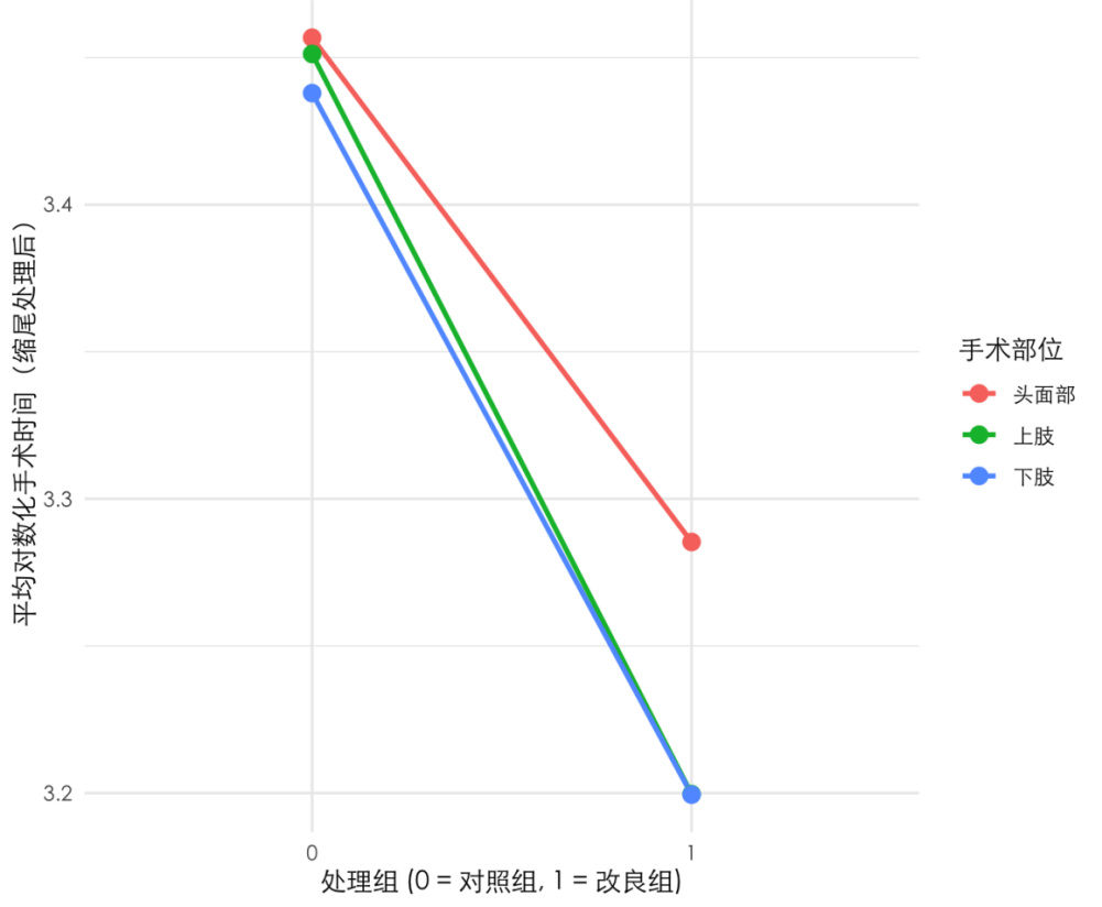 3 结果通过对清创时间进行对数转换和缩尾处理,我们减少了数据的偏态和极端值影响,伤口的污染程度(1级40.5%,2级34.5%,3级24.5%)。模型中包含处理变量(改良与否)、手术部位的交互项,以及伤口大小、医生经验等控制变量。结果如下:变量描述性统计包括清创时间、对数清创时间、缩尾后对数时间、伤口大小、污染程度和医生经验。见表 1。清创时间的均值为31.20 min,显示出一定的变异性。对数转换后的时间均值为3.35 min,表明数据集中趋势。伤口大小和医生经验的均值分别为8.37 cm2和11.10年,反映了样本的多样性和医生的广泛经验。