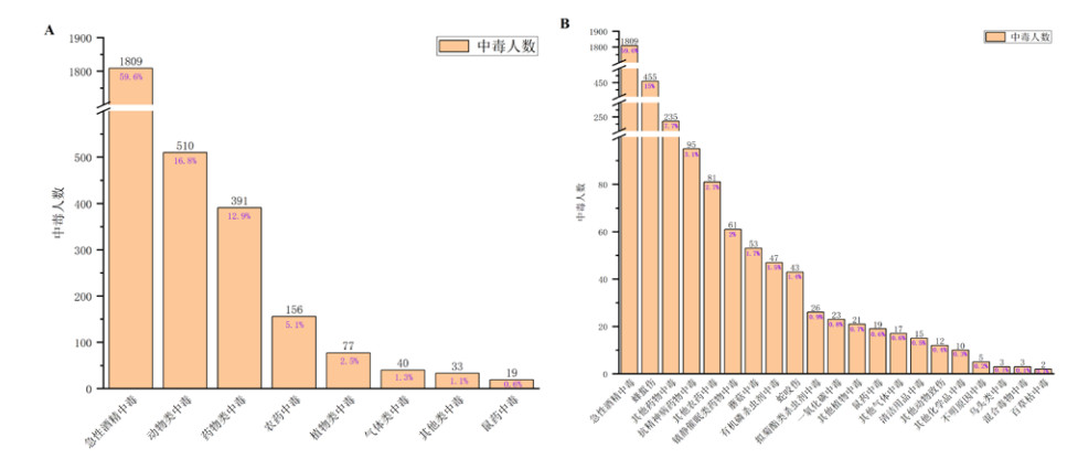 急性中毒是急诊医学的重要内容,是急诊科常见疾病之一,严重危害公众健康与社会安全[9]。我国突发中毒事件卫生应急信息平台数据显示,2016—2022年急性中毒病例排名前5位的分别为农药(30.4%)、药物(22.4%)、工业/日用化学品(20.4%)、动物(13.7%)和真菌(6.9%)[10],但该数据未包含急性酒精中毒病例。通过整合我国其他大型研究发现[11-13],急性酒精中毒仍然是我国急性中毒的最常见类型,这与本研究结果[1 809例(59.6%)]一致。本研究中,急性中毒的主要毒物类型还包括动物(16.8%)、药物(12.9%)、农药(5.1%)和植物(2.5%)。尽管此毒物谱系与国家平台数据[10]整体相似,但具体排序有所不同,这或许与当地独特的地理环境,如气候潮湿、山地丘陵广布及由此带来的丰富动植物多样性有关。