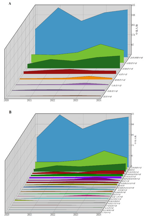 | 注:A为急性中毒一级诊断类型;B为急性中毒二级诊断类型 图 2 重庆市万州区2020—2024年急性中毒年度变化趋势 Fig 2 Temporal trends of acute poisoning in Wanzhou District, Chongqing, 2020–2024 |