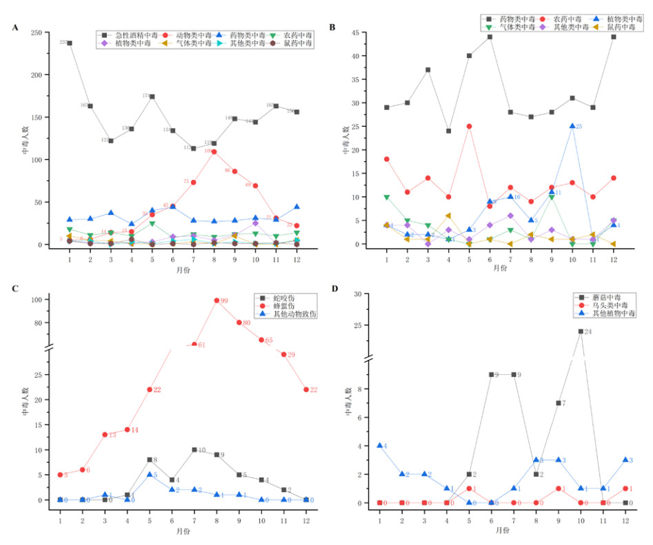 本研究显示,急性酒精中毒好发于1月,动物类中毒集中于6~10月高发(图 3A)。由于上述两类中毒的病例数显著多于其他类型,剔除后进一步分析发现,植物中毒在10月呈现明显高峰,而其他类型中毒未见月份集中现象(图 3B)。动物类中毒的二级诊断分型与其一级诊断的发病时间分布相似,高发期集中于5~10月(图 3C)。植物类中毒的二级诊断中,蘑菇中毒主要集中于6~10月,而乌头类及其他植物中毒未表现出明显的月份聚集性(图 3D)。