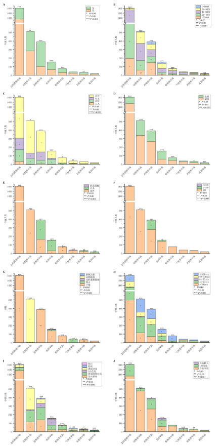 性别与年龄分层结果显示,急性酒精中毒与动物类中毒以男性为主,药物类、农药、植物类及其他类中毒多见于女性,急性酒精中毒好发于20~60岁人群,20岁以下人群为药物类中毒不可忽视的发病群体,且学生群体与其他职业相比在职业分层中差异有统计学意义(图 4A~4C)。农药与鼠药中毒以农村人口居多,药物类、农药及鼠药中毒多为蓄意自杀,此外,药物与农药中毒还是同时接触2种及以上毒物的主要类型(图 4D~4F)。除农药与其他类中毒途径较为多样外,其余类型中毒途径相对单一(图 4G)。植物类中毒就诊时间多超过2 h,其他类型中毒多在2 h内就诊(图 4H)。农药中毒患者中120入院、入住ICU和急诊死亡的比例均较高(图 4I、4J)。