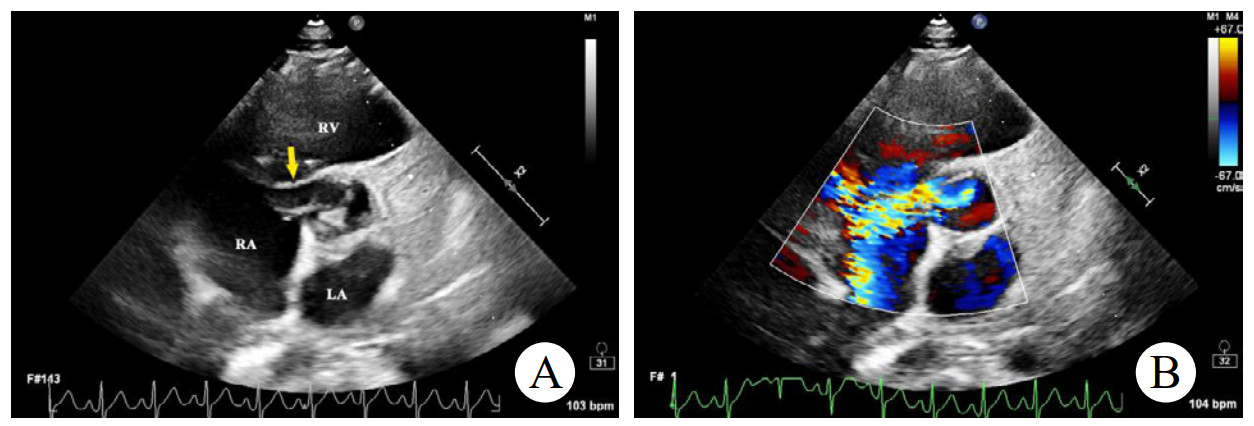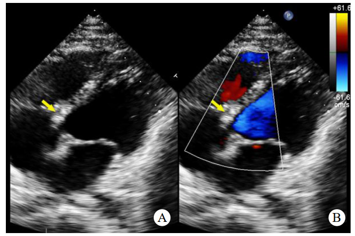 | 注:A为2D超声显示右乏氏窦瘤破裂(黄色箭头)突向右心房形成“囊袋状”结构;B为CDFI显示窦瘤破裂处自主动脉至右心房的左向右分流束 图 1 2D、CDFI显示主动脉短轴切面右乏氏窦瘤破裂情况 |