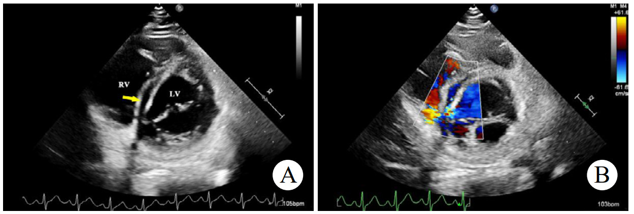| 注:A为2D超声显示胸骨旁四腔心切面右乏氏窦瘤破裂修补处(黄色箭头)回声增强,连续性好;B为CDFI显示该处分流消失 图 5 2D及CDFI显示右乏氏窦瘤破裂修复术和主动脉瓣成形术后表现 |