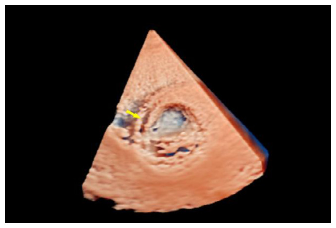 | 图 3 3D超声显示左室短轴切面室间隔夹层动脉瘤立体结构 |
