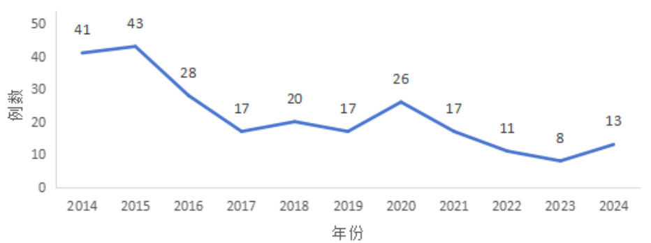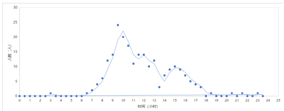 从时间分布上来看,2014—2024年期间RRS触发数量总体呈下降趋势,按24 h划分,09:00~13:00时段为高峰期,10:00与12:00前后达到峰值。见图 1图 2