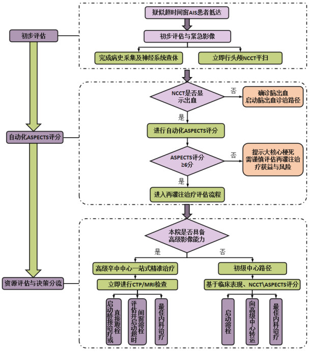 | 图 1 超时间窗AIS患者基于自动化ASPECTS评分急诊影像评估与决策路径 |
