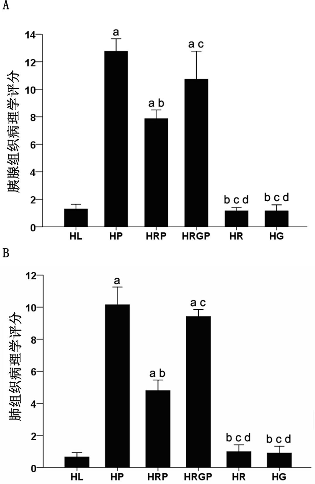 与HL组比较,aP<0.05;与HP 组比较,bP<0.05;与HRP组比较,cP<0.05;与HRGP组比较,dP<0.05 图 2 各组大鼠胰腺、肺组织的病理评分 Figure 2 Comparison of the total pathological score in the pancreas(A) and lung(B) among groups