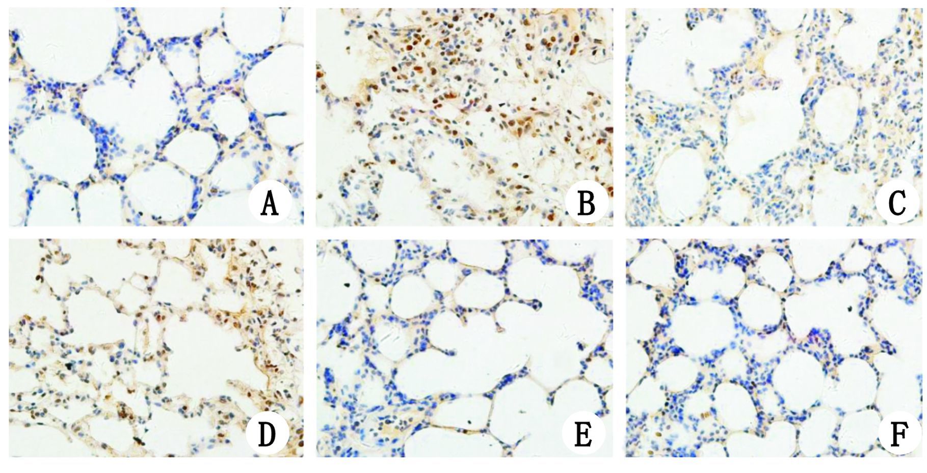 A:HL组大鼠肺组织仅可见胞浆内微量表达,细胞核内未见表达NF-κB p65;B,D:分别为HP组和HRGP组,均可见胞核内大量表达NF-κB p65;C:HRP组胞核内NF-κB p65表达明显较HP组和HRGP组减少,胞浆内仅微量表达;E,F:分别为HR组和HG组,可见胞浆内极微量表达NF-κB p65,细胞核内未见表达 图 3 各组肺组织NF-κB p65表达免疫组化结果(×400) Figure 3 Immunohistochemical localisation of NF-κB p65 in the lung tissue of all groups (×400)