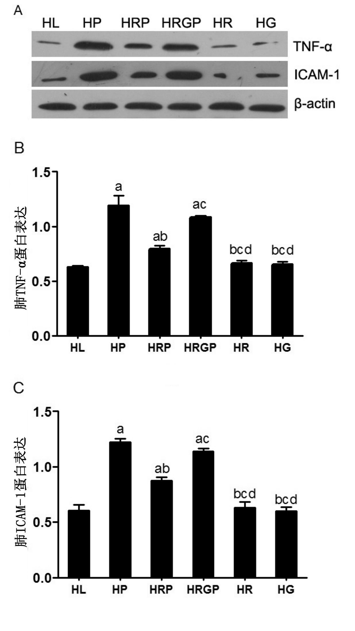 与HL组比较,aP<0.05;与HP组比较,bP<0.05;与HRP组比较,cP<0.05;与 HRGP组比较,dP<0.05 图 4 各组大鼠肺组织TNF-α和ICAM-1蛋白表达情况 Figure 4 Western blotting used to measure the activation of TNF-α and ICAM-1 in lung tissue of all groups