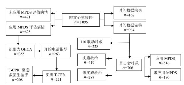 1 096例急救医生现场判断为OHCA事件中,调度员应用MPDS判断病情625例(57.03%),识别为OHCA 355例(32.39%),进入电话指导流程263例(23.40%),电话指导实施心肺复苏221例(20.16%),电话指导至急救医生到达现场207例(18.89%)。