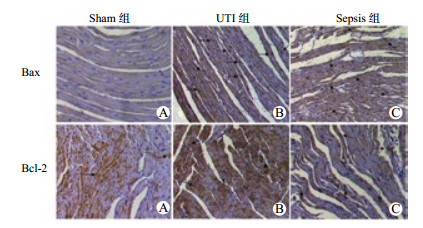 与Sham组比较, Sepsis组心肌有炎症细胞浸润, 细胞水肿及空泡形成, UTI组抑凋亡蛋白Bcl-2在Sham组和UTI组中的心肌细胞中均有阳性表达, 在Sepsis组相对减少。凋亡蛋白Bax表达在Sepsis组呈褐色(表达量越多, 颜色越深), 凋亡蛋白表达明显, 而UTI组Bax蛋白表达相对Sepsis组明显减少, 在Sham组蛋白表达不明显(图 2)。