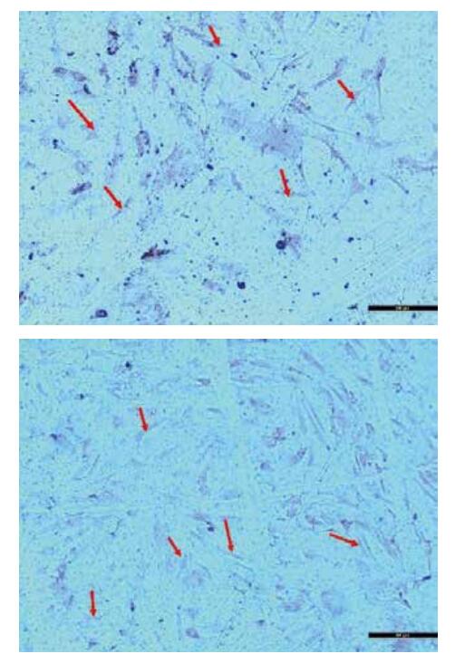| 图 1 上图红色箭头所指棕色铺路石样细胞即为内皮细胞 Figure 1 Cells arrowed by red points with brown paving flagstone were endothelial cells |