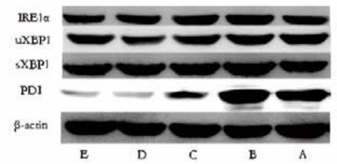1.1.5 Western blot检测IRE1α、uXBP-1、sXBP-1及PDI表达水平收集各组细胞,按照普利莱细胞提取说明书,提取蛋白,采用BCA法检测蛋白浓度。蛋白上样量为30 μg,SDS聚丙烯酰胺胶电泳浓缩胶质量分数为4%,uXBP-1、sXBP-1及PDI分离胶质量分数为10%,IRE1α分离胶质量分数为8%。采用恒流25 mA,电泳至溴酚蓝跑至玻璃板底面时,即停止电泳,约2 h,进行转膜,90 mA电泳1 h,ECL显影。采用Imaage J软件对条带进行分析,计算出灰度值,用目标条带灰度值分别于对应内参β-actin灰度值的比值来衡量表达情况,作为IRE1α、uXBP-1、sXBP-1及PDI的相对表达量。