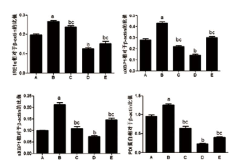 与对照组相比较,aP < 0.05;与LPS组比较,bP < 0.05;与LPS+5μL/mL比较,cP < 0.05。 A:对照组;B: LPS组;C: LPS+1 μL/mL血必净组;D: LPS+5 μL/mL血必净组;E: LPS+25 μL/mL血必净组 图 3 IRE1α、uXBP1、sXBP1、PDI与β-actin的比值 Figure 3 Changes in the ratio of IRE1α, uXBP1, sXBP1, and PDI to β-actin |